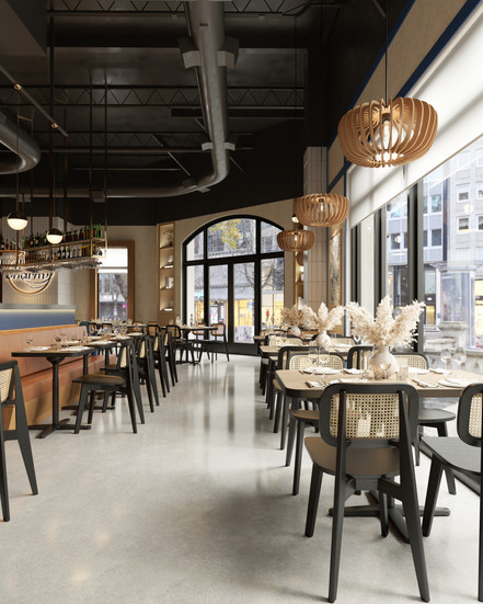 The atmosphere is grounded by polished concrete floors and anchored by warm caramel-toned banquettes that run the length of the space. Dark timber dining chairs with rattan backs bring a nod to heritage craftsmanship, while the soft oak tabletops set the stage for quiet gatherings.