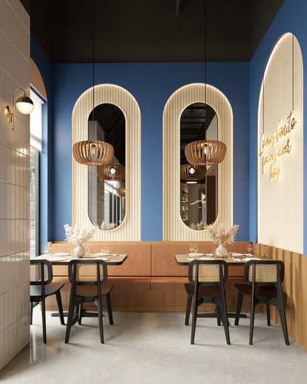 Punctuating the dining experience are sculptural pendant lights crafted in natural wood, suspended rhythmically above each row of tables. The palette is confident yet comforting—deep navy blue walls contrast beautifully with natural birch slats and minimalist arch mirrors that elongate the room with a sense of graceful repetition.